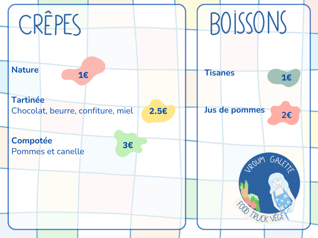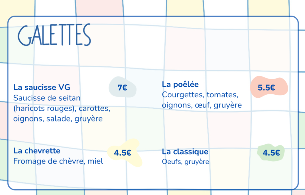 Galettes : la Chevrette, la Saucisse VG, la Poêlée, la Classique.